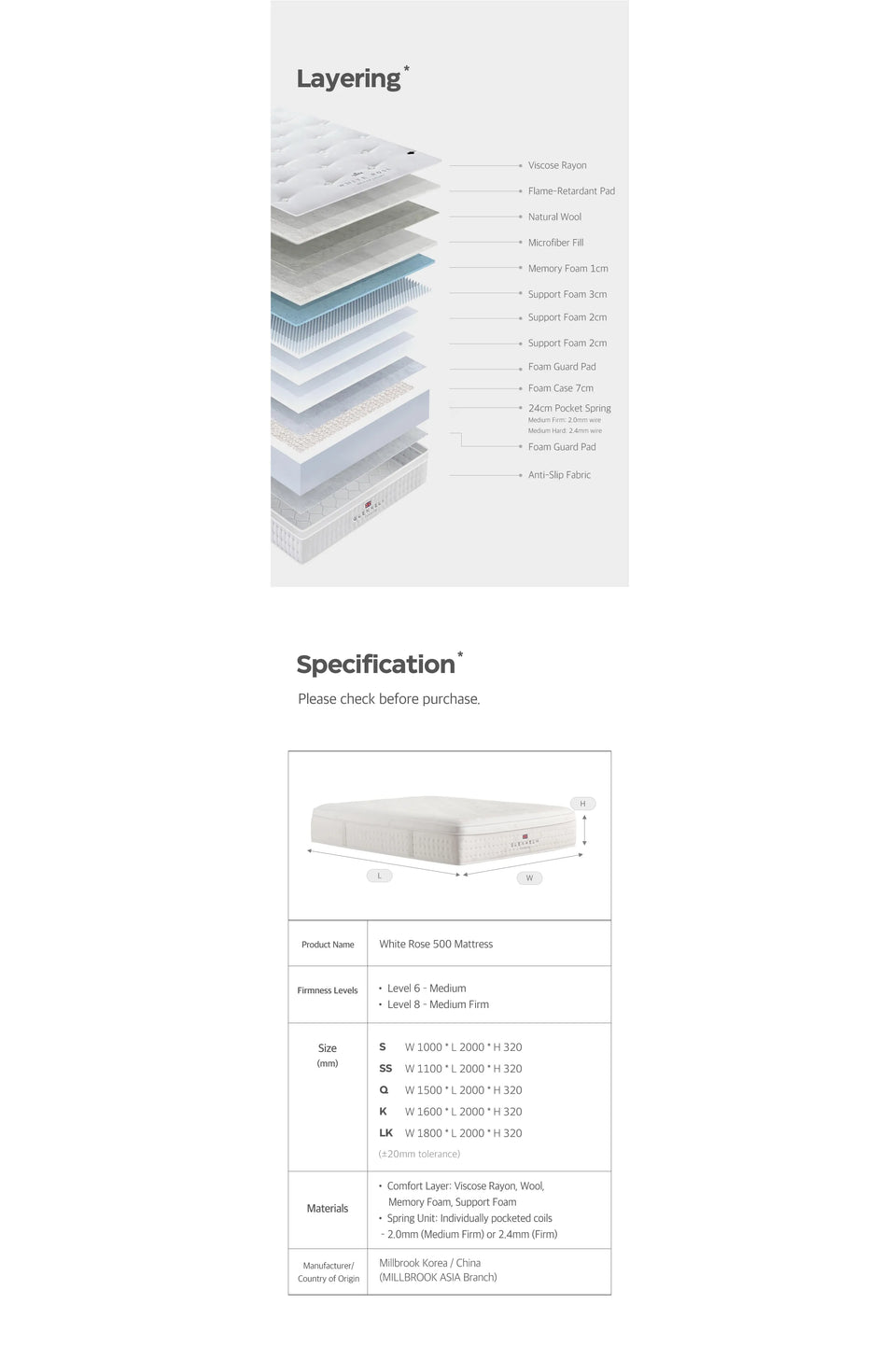 • 舒适层:人造丝、羊毛、记忆海绵、支撑海绵
